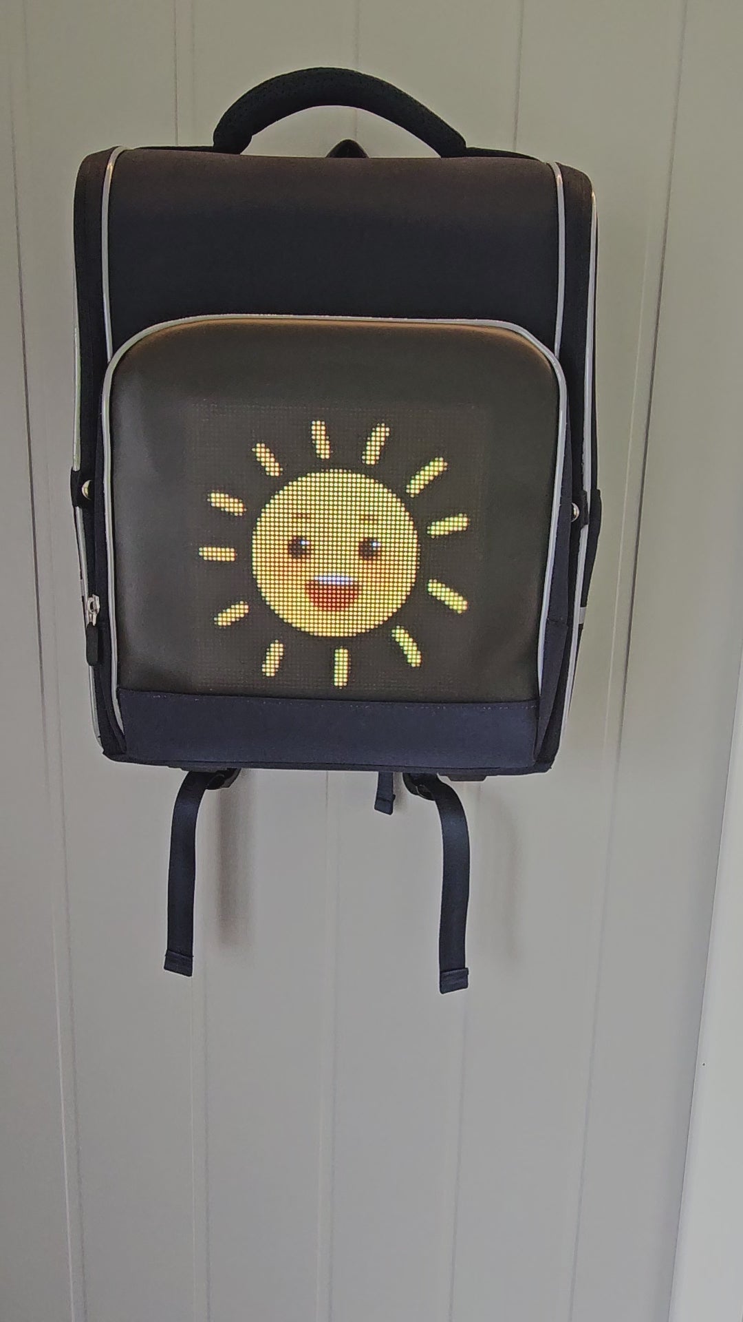 Ergonomisk skolesekk med LED-skjerm. Vis dine egne emoji, bilder, tekster, GIF-animasjoner, og forhåndsprogrammerte animasjoner fra APP. Sekken har USB kabel som koples til strømbank / powerbank batteri med lang levetid.